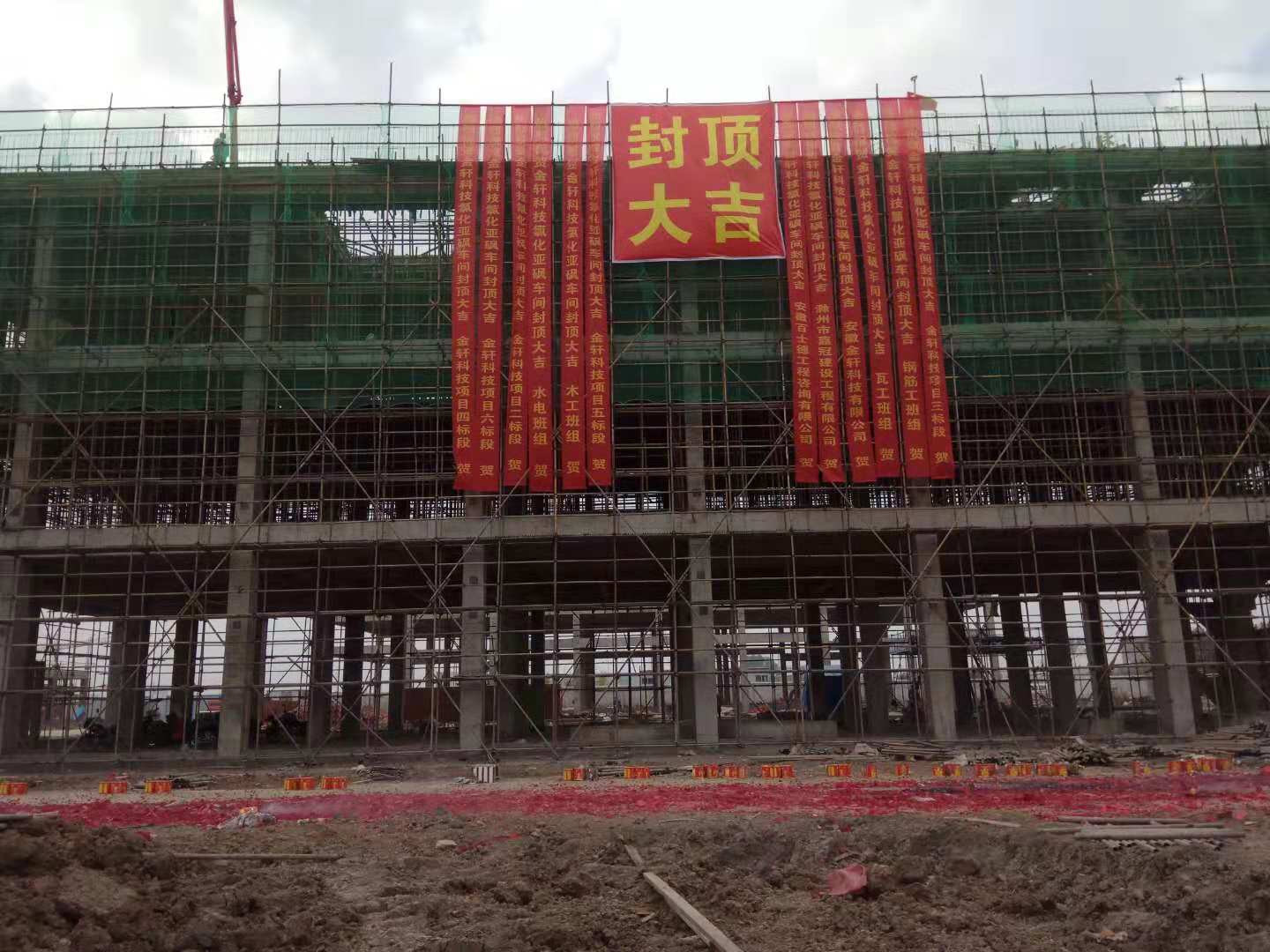 2018年11月4日,安徽金轩科技有限公司循环经济产业园一期项目土建工程第一标段氯化亚砜车间主厂房顺利完成封顶。