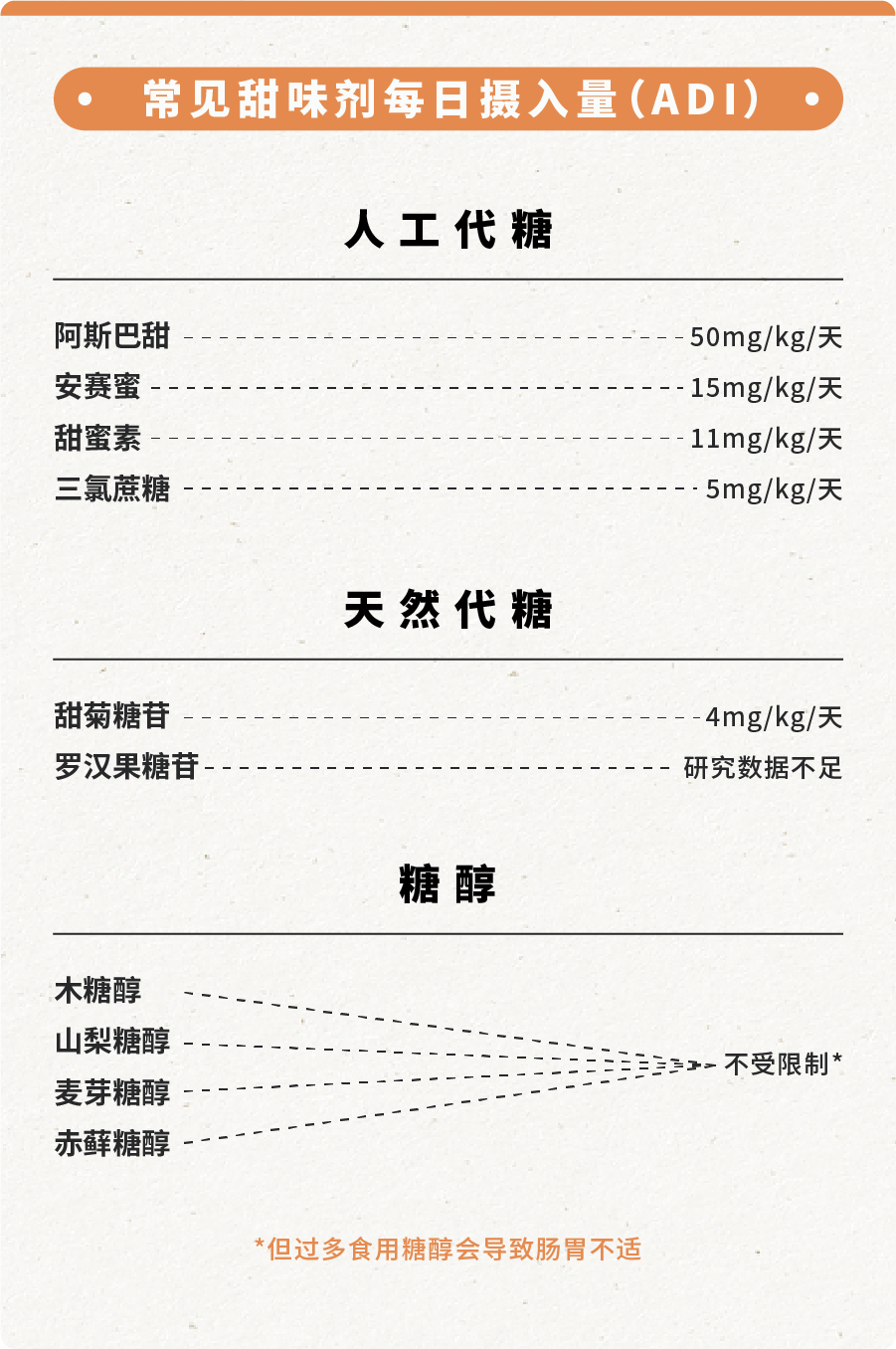 常见代糖的每日摄入量,我们也整理出来了,供大家参考