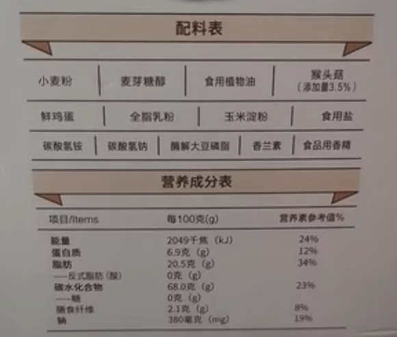 比如这款无糖饼干,虽然没有蔗糖,但油也没少放。每百克的热量将近500千卡,大概约等于5碗白米饭吧。