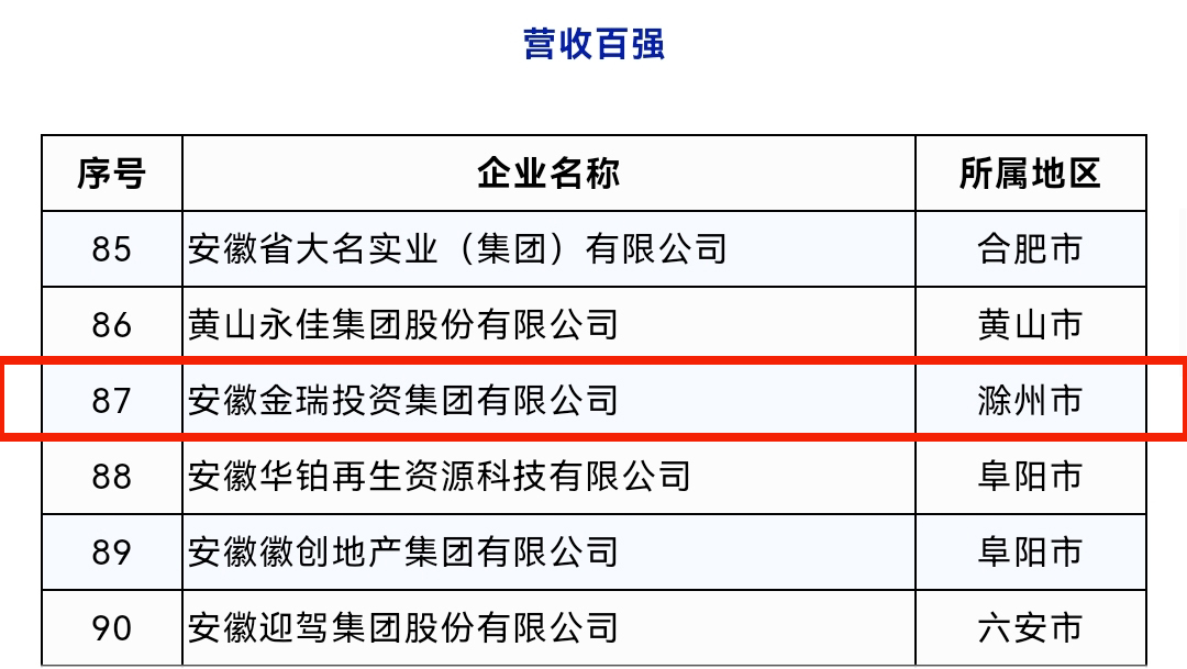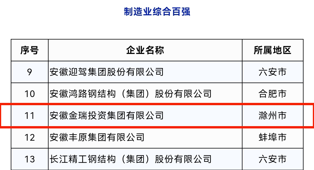 6686体育母公司——安徽金瑞投资集团有限公司位列营收百强第87位、制造业综合百强11位。