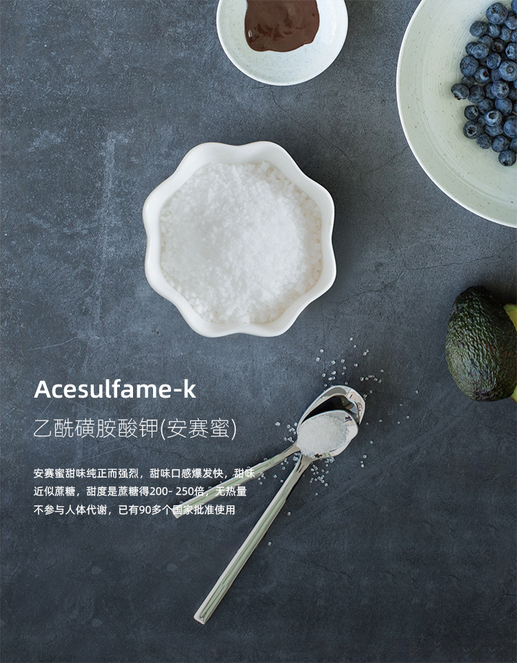 目前已有90多个国家正式批准安赛蜜可用于烘焙产品,糕点,固体饮料,糖果,果酱,口香糖,速溶咖啡,乳制品,果冻,布丁,甜味剂等,可用于口腔卫生/化妆品(可用于口红、唇膏、牙膏和漱口液等)及药剂(用于糖浆制剂、糖衣片、苦药掩蔽剂等)等领域中。也可以用作液体、固体和复配餐桌甜味剂。 安赛蜜对光、热(能耐 225℃高温)稳定,pH值适用范围较广(PH2~10范围内稳定),是当前世界上稳定性最好的甜味剂之一。使用时不与其它食品成分或添加剂发生反应。适用于焙烤食品、乳制品和酸性饮料。食品中添加量按照GB2760规定执行。