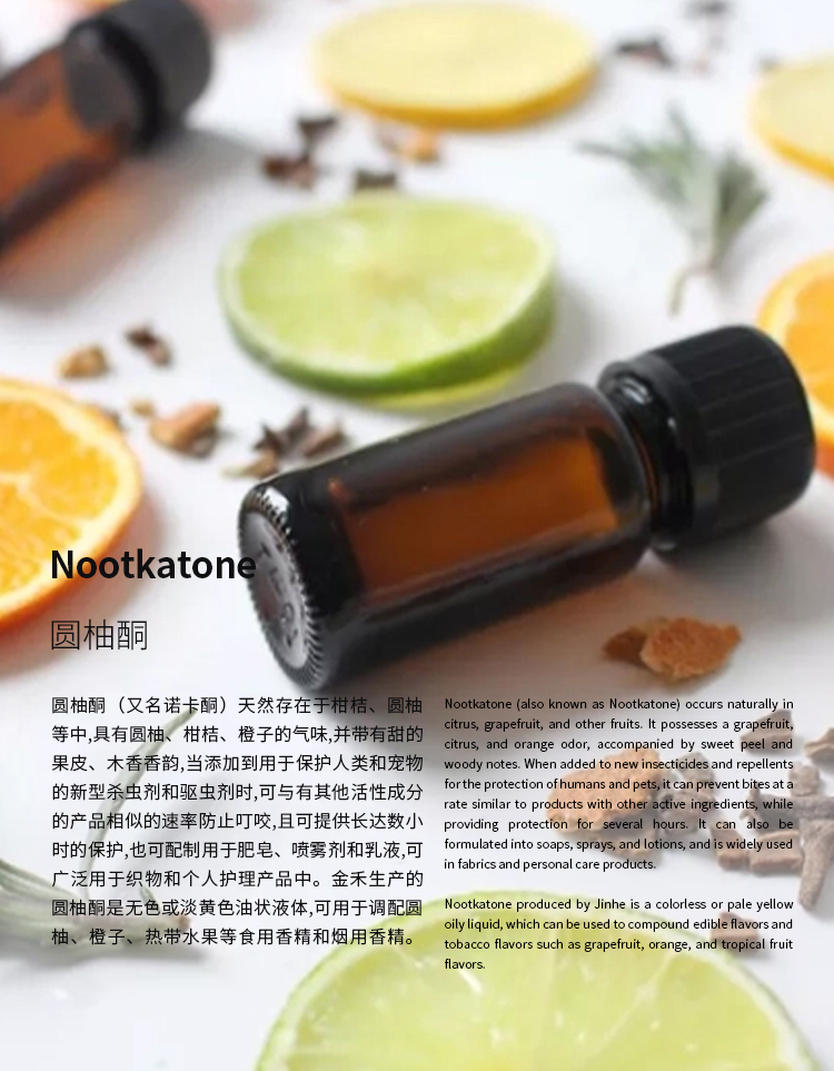 天然存在于柑桔、圆柚等中,具有圆柚、柑桔、橙子的气味,并带有甜的果皮、木香香韵,当添加到用于保护人类和宠物的新型杀虫剂和驱虫剂时,可与有其他活性成分的产品相似的速率防止叮咬,且可提供长达数小时的保护,也可配制用于肥皂、喷雾剂和乳液,可广泛用于织物和个人护理产品中。6686体育生产的圆柚酮是无色或淡黄色油状液体,可用于调配圆柚、橙子、热带水果等食用香精和烟用香精。
